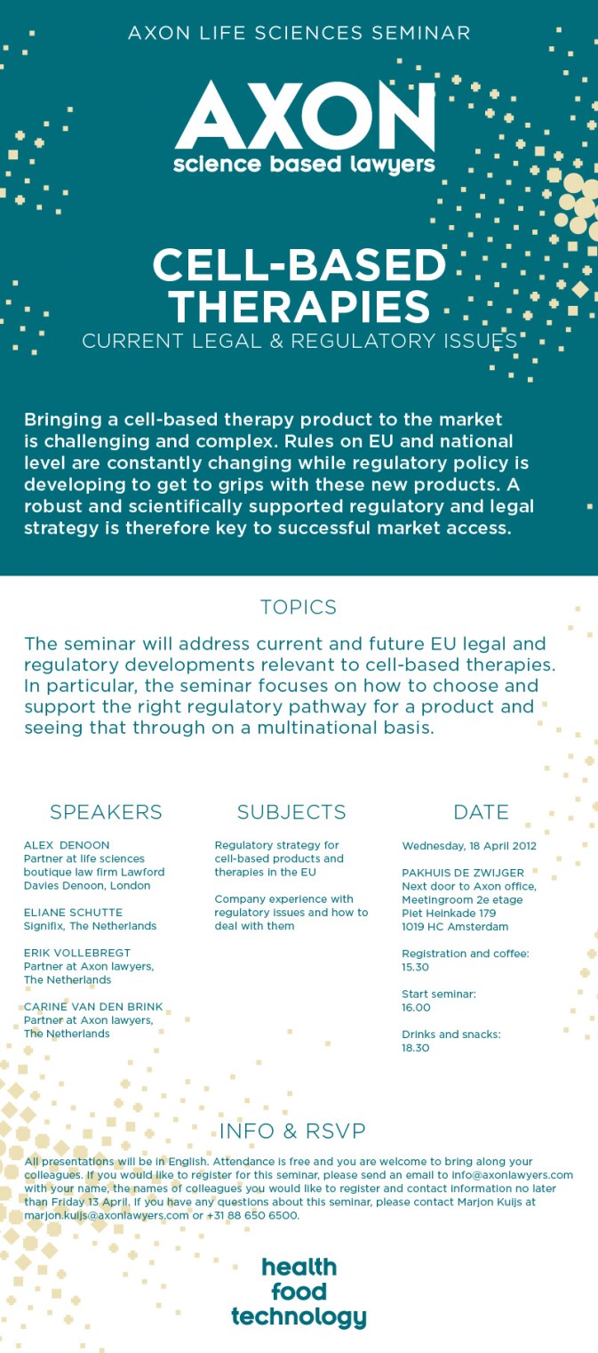 I hope you won’t mind me doing a little bit of marketing for the non-devices activities of my firm. Axon Lawyers organises a seminar on cell-based therapies on 18 April in Amsterdam, which will be very interesting for companies thinking about or already underway with such products in the EU as it will be specifically focused on the difficult questions and practical problems that a company faces in bringing this type of product to the market. We have secured some veritable opinion leaders in the field and attendance is completely free, but please RSVP so we won’t have to disappoint people. If you feel this seminar would benefit anyone, whether in your company or not, please feel free to forward the invitation. If you would like to receive the seminar presentations and handouts, we will be happy to send them to you if you send us an email at the RSVP email address.