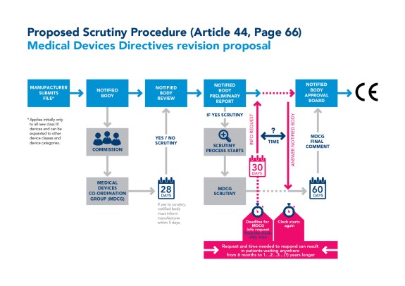 In a nutshell the aim of the MDR is that supervision of notified bodies, conformity assessment procedures, clinical investigations and clinical evaluation, vigilance and market surveillance are significantly reinforced, whilst provisions ensuring transparency and traceability regarding devices are introduced. Eucomed is happy with it because much stays the same (no PMA) except for the scrutiny procedure (see below), but their worst fears may still come true in the legislative process that the proposal has now entered.